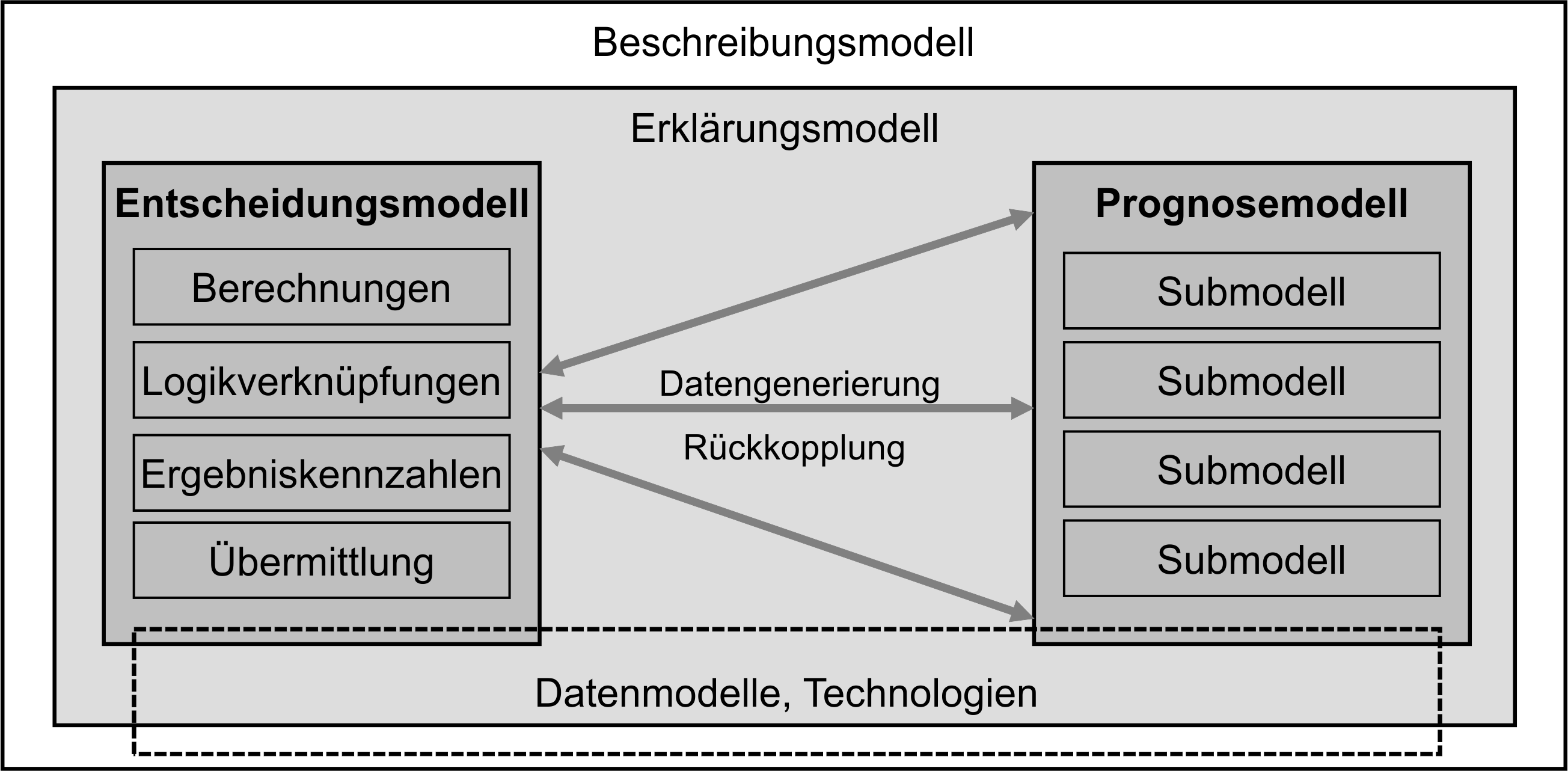 Ein zentrales Kriterium für die Anwendung der Entscheidungsmodelle ist eine ausreichende Datengrundlage. Andernfalls könnten theoretisch geeignete Formeln und Algorithmen in die immobilienanalytischen Modelle zwar technisch implementiert werden, diese würden jedoch ohne schlüssige Verknüpfungen zu Marktentwicklungen, Portfoliomanagementpro-zessen und anderen Einfluss¬bereichen keine Relevanz für die praktische Entscheidungssituation besitzen. Im Kapitel 3 wird diese Verknüpfung über eine mehrstufige Deduktion bis auf eine detaillierte Parameterebene an einem ausgewählten Entscheidungs-modell beispielhaft entwickelt. Auf der Detailebene der Eingangsparameter wird deutlich, dass nur ein Teil der notwendigen Informationen in den operativen Systemen bereits vorliegt oder über Schnittstellen eingebunden werden kann. Für einen weiteren Teil des Datenbedarfs können externe Anbieter angefragt werden (empirische Erhebung zu verfüg-baren Marktdaten). Eine signifikante Menge der Modellparameter umfasst jedoch zukunftsbezogene Kennzahlen zu technischen, nutzungsbezogenen und wirtschaftlichen Sachverhalten. Diese sind zu prognostizieren bzw. zu planen. Daraus ergeben sich entspre-chende Anforderungen an eine zweite, parallel zu installierende Modellgruppe, die Prognosemodelle.